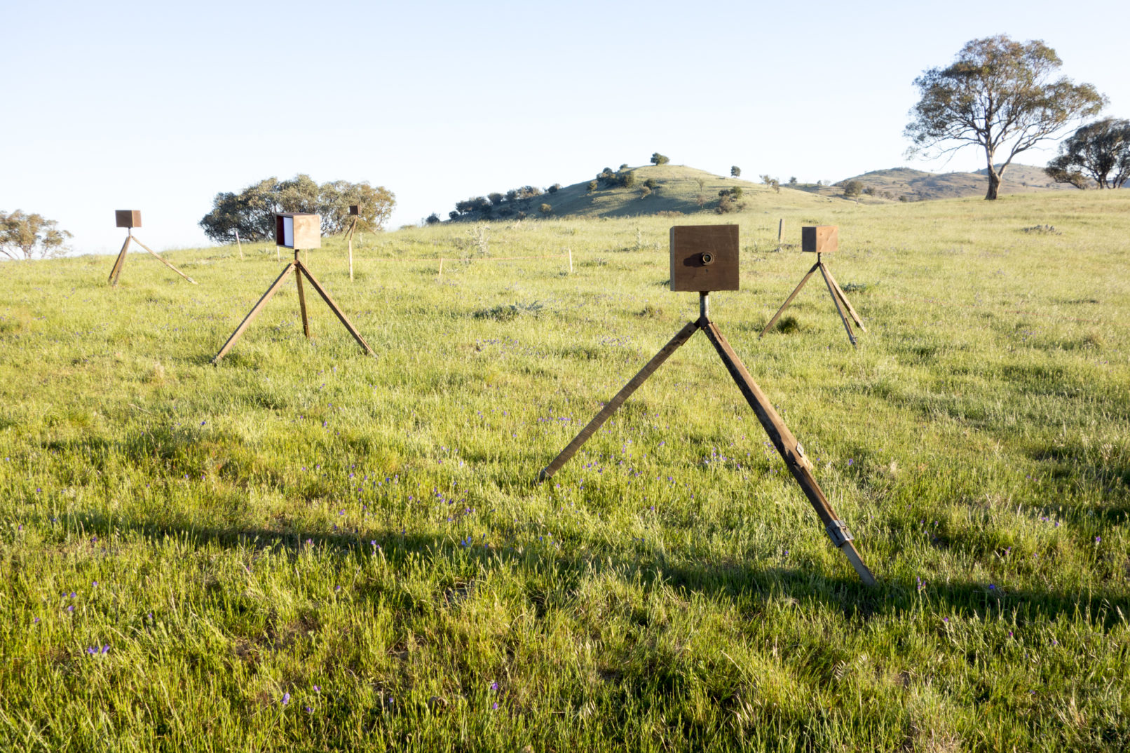 So we took the plunge and have created tiny diaromas that have been set up across the Wired Lab site in scale with the footprint of the Beggan Beggan shearing shed. Our signature low-tech site-specific, to-scale photographic sculptures are housed in custom built camera-like boxes. The boxes sit on handmade timber tripods that reflect the age of the timber used to construct the Beggan Beggan shearing shed. Bi-convex single stereo lenses and motion sensing LED lights bring the internal images to life, reflecting scenes from in and around the shed in a kind of analogue Virtual Reality.